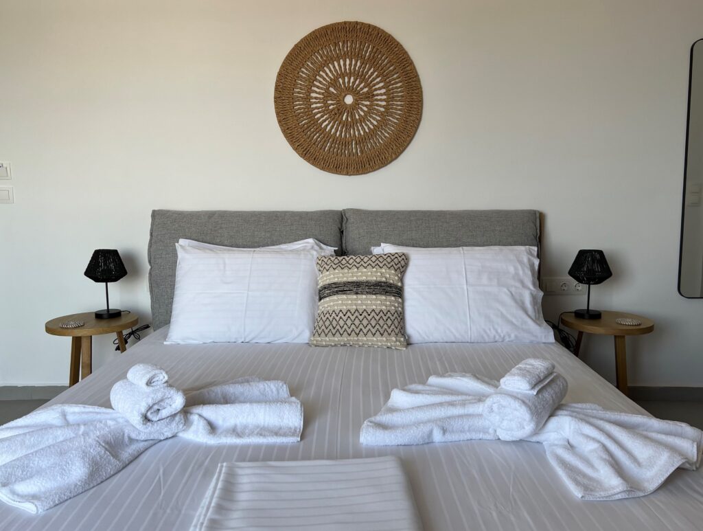 All our Deluxe Double Rooms have furnished balconies with side sea views and boast minimalistic modern furniture. They feature a king sized bed and a single sofa bed. The private bathrooms have a walk-in shower.